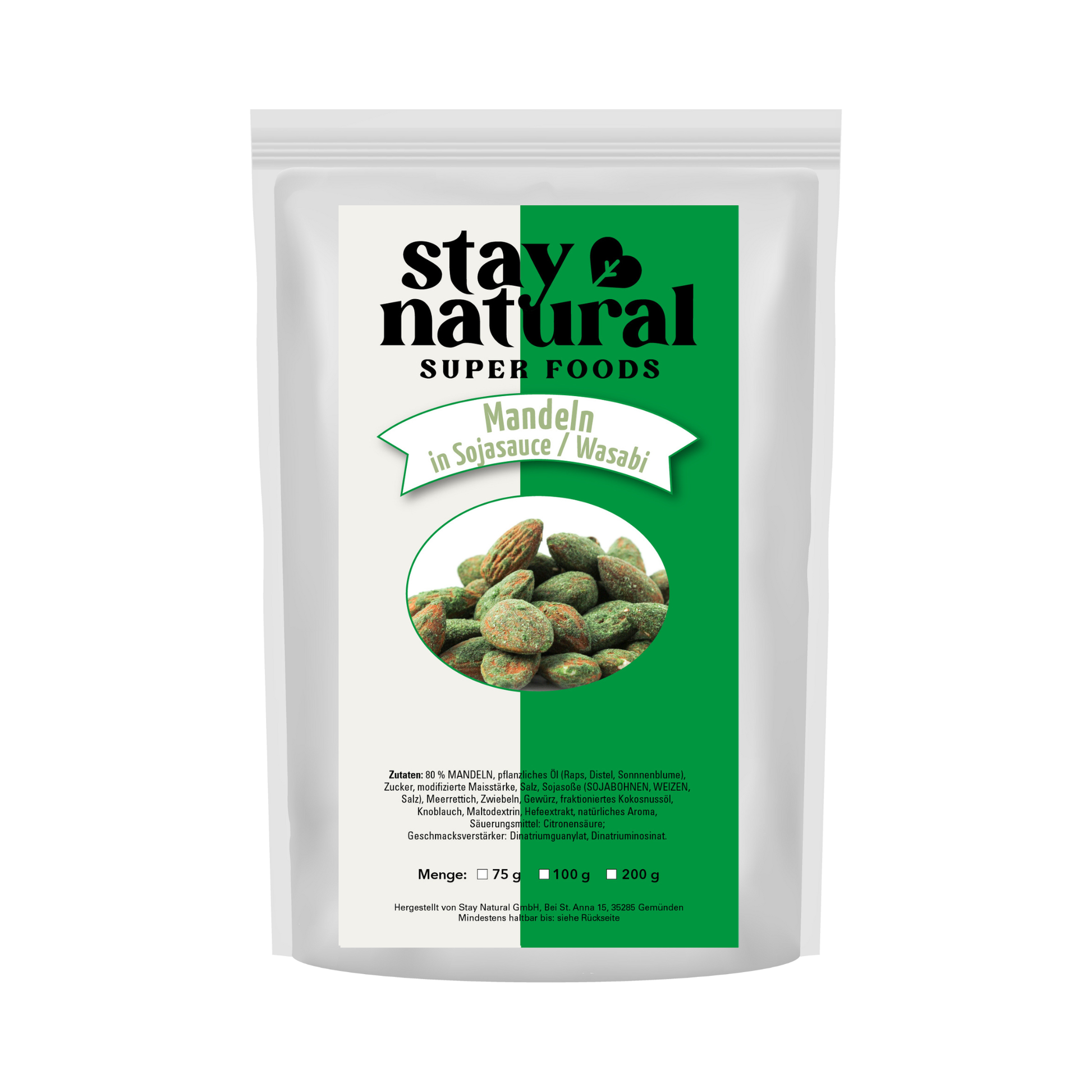 🌾 Mit 80 % ganzen Mandeln Geröstet und gewürzt mit Sojasauce, Meerrettich, Zwiebeln und Wasabi – für ein intensives Geschmackserlebnis.