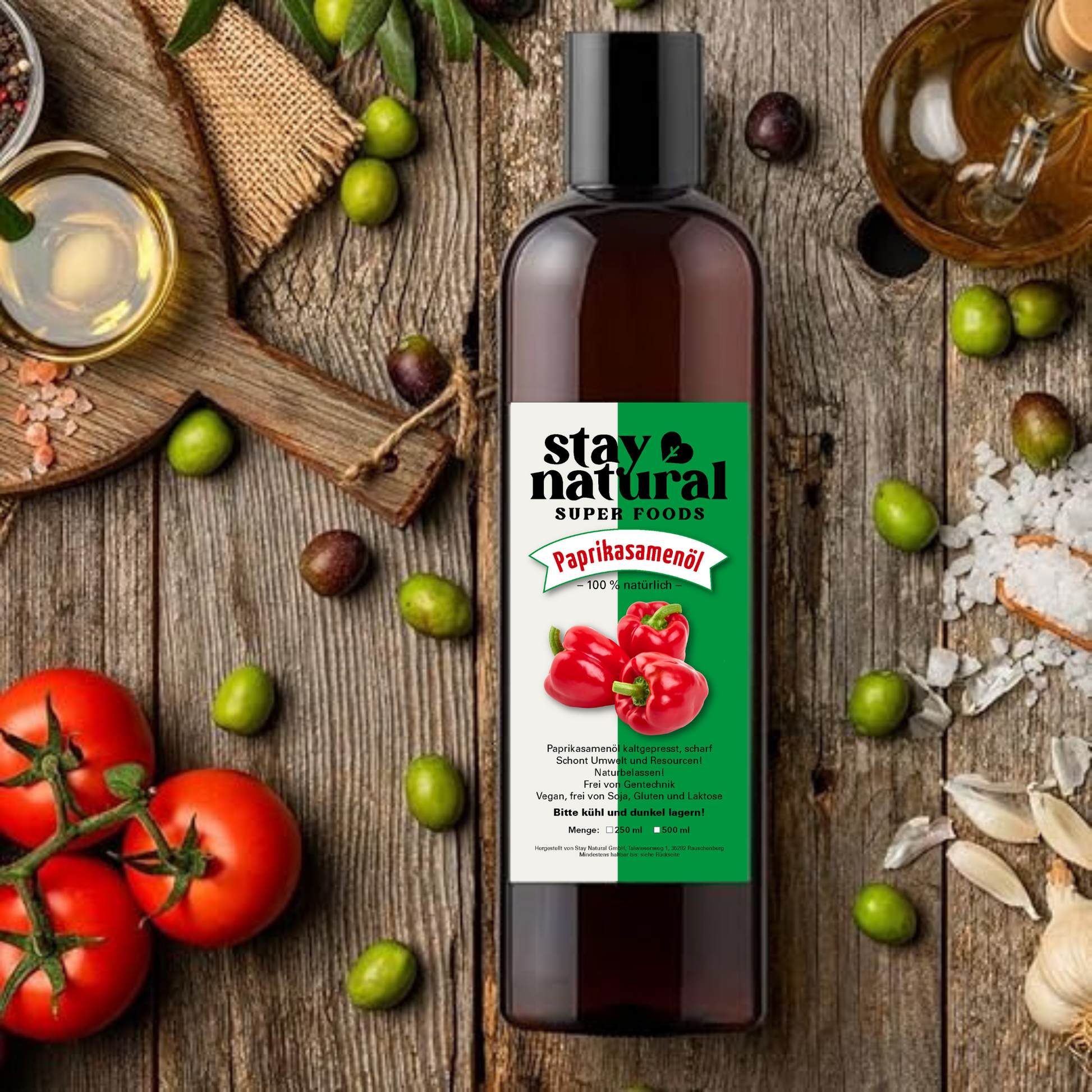 🧴 Kaltgepresst & naturbelassen Schonend gewonnenes Öl aus hochwertigen Paprikasamen – voller natürlicher Nährstoffe und Qualität.