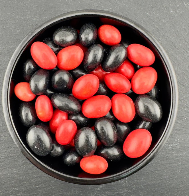 🍬🔥 Knusprig & farbenfroh – Knusperdragees mit Salmiakgeschmack Ein echter Hingucker mit intensivem Geschmack: knackige Dragées in leuchtendem Rot und Schwarz – mit salzig-würziger Note und süßem Crunch.